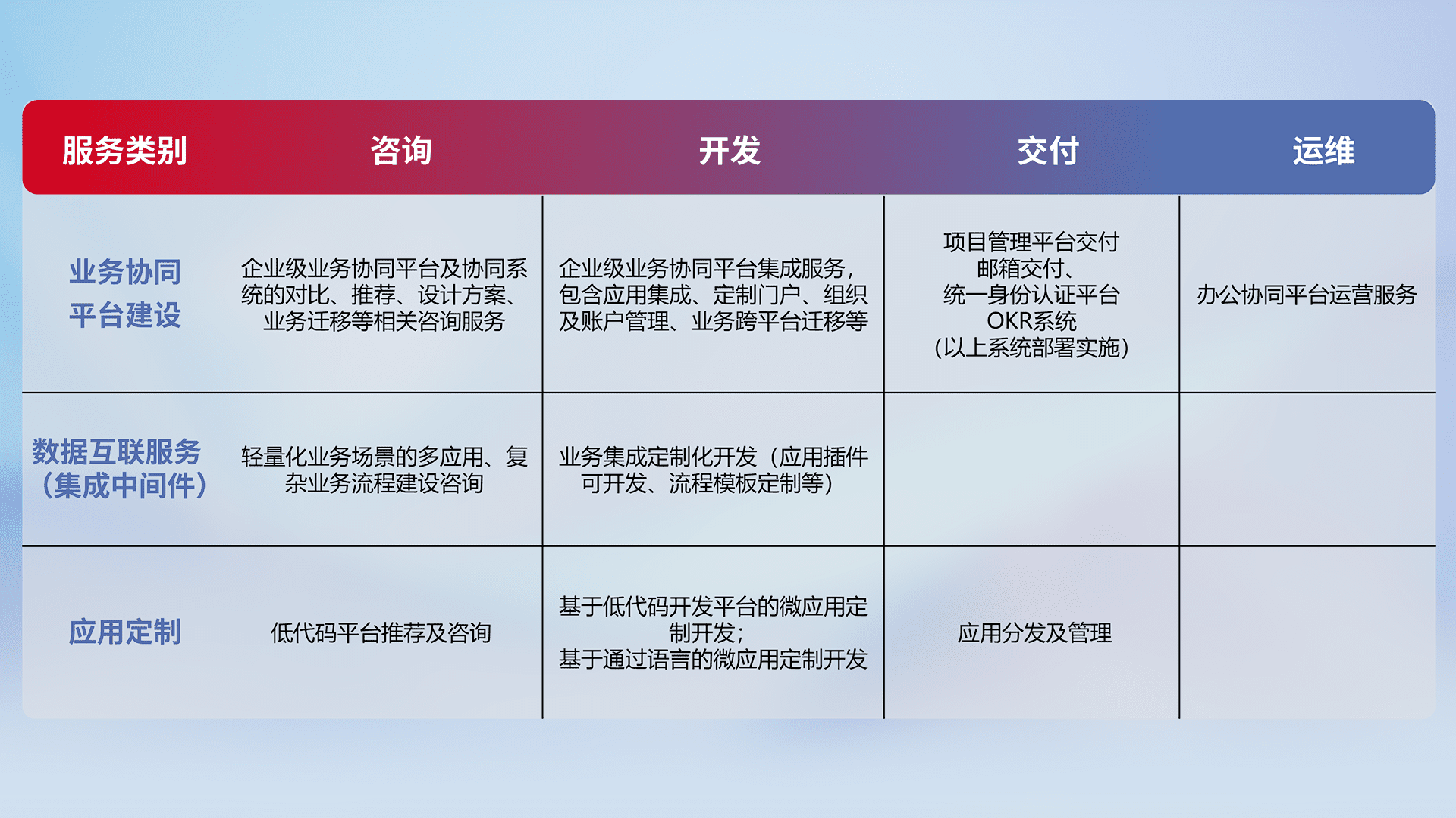 针对钉钉、、企微、、、、IDaas等平台级产品提供产品的规划、、方案、、、、交付、、、、定制化开发等服务,,,,实现如统一协同办公、、智能客户服务、、、混合会议管理、、、、智能数据查询、、、等业务场景,,,实现数字化转型。。。。