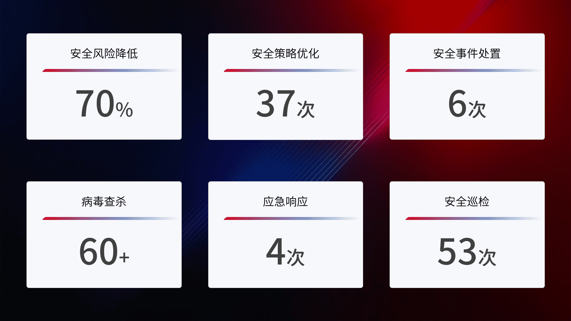 提供全面的安全事件报告体系,,,包括处置报告、、、周报、、、季度和年度总结,,结合持续监控,,帮助客户深入了解网络安全状况。。。
